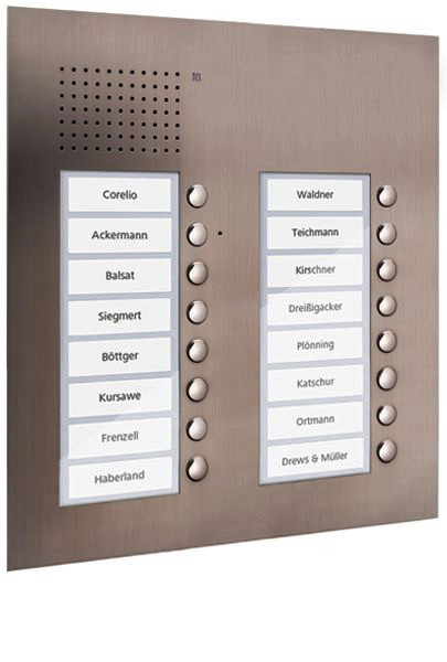 für 16 Wohneinheiten, Unterputzmontage, Frontplatte 3 mm, win:clip-Prinzip, Namensfeldgröße: H 19 mm x B 62 mm, Metallklingelknöpfe mit vergoldeten, wartungsfreien Kontakten, langlebige und energiesparende Namens- / Infoschildbeleuchtung, bruchsicheres Namensschildglas, Quittungston beim Drücken der Klingeltaste, Sprechgitter gelocht, Frontplatte: Edelstahl geschliffen, 3-Draht-Technik erforderlich, zulässige Umgebungstemperatur: -20 Grad C bis 50 Grad C, Maße Frontplatte: H 296 mm x B 274 mm x T 3 mm, Maße UP-Kasten: H 247 mm x B 250 mm x T 40 mm