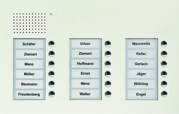 für 18 Wohneinheiten, Unterputzmontage, Frontplatte 3 mm: win:clip-Prinzip, Namensfeldgröße: H 19 mm x B 62 mm, Metallklingelknöpfe mit vergoldeten, wartungsfreien Kontakten, langlebige und energiesparende Namensschildbeleuchtung, bruchsicheres Namensschildglas, Quittungston beim Drücken der Klingeltaste, Material / Farben: Aluminium weiß pulverbeschichtet (WS), 3-Draht-Technik erforderlich, zulässige Umgebungstemperatur: -20 Grad C bis 50 Grad C, Maße Frontplatte: H 252 mm x B 398 mm x T 3 mm, Maße UP-Kasten: H 203 mm x B 374 mm x T 40 mm