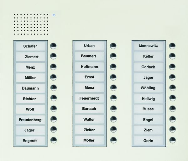für 30 Wohneinheiten, Unterputzmontage, Frontplatte 3 mm, win:clip-Prinzip, Namensfeldgröße: H 19 mm x B 62 mm, Metallklingelknöpfe mit vergoldeten, wartungsfreien Kontakten, langlebige und energiesparende Namensschildbeleuchtung, bruchsicheres Namensschildglas, Quittungston beim Drücken der Klingeltaste, Material / Farben: Aluminium weiß pulverbeschichtet (WS), 3-Draht-Technik erforderlich, zulässige Umgebungstemperatur: -20 Grad C bis 50 Grad C, Maße Frontplatte: H 340 mm x B 398 mm x T 3 mm, Maße UP-Kasten: H 291 mm x B 374 mm x T 40 mm