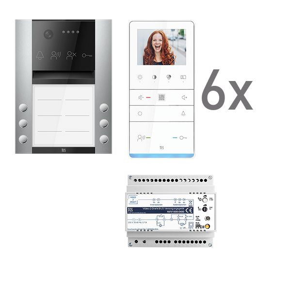 Vorkonfiguriertes Video Paket für 6 Wohneinheiten für den TCS:BUS bestehend aus: 1x PES PRO Video Außenstation 6T AP EN, Artikelnummer: AVA610206-0010, vorprogrammiert, 6x TASTA PRO Video Freisprecher 3,5" AP WS, Artikelnummer: IVW6511-0145, 1x Video-2-Draht:BUS Versorgungsgerät, Artikelnummer: NVV1000-0400. Das Paket ist ab Werk vorkonfiguriert und bedingt erweiterbar. Die Funktionen der Innen- und Außenstationen können mit TCS-Serviceprodukten bedingt verändert werden.