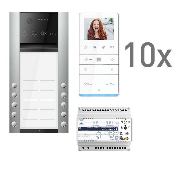 Vorkonfiguriertes Video Paket für 10 Wohneinheiten für den TCS:BUS bestehend aus: 1x PES PRO Video Außenstation 10T AP EN, Artikelnummer: AVA620210-0010, vorprogrammiert, 10x TASTA PRO Video Freisprecher 3,5" AP WS, Artikelnummer: IVW6511-0145, 1x Video-2-Draht:BUS Versorgungsgerät, Artikelnummer: NVV1000-0400. Das Paket ist ab Werk vorkonfiguriert und bedingt erweiterbar. Die Funktionen der Innen- und Außenstationen können mit TCS-Serviceprodukten bedingt verändert werden.