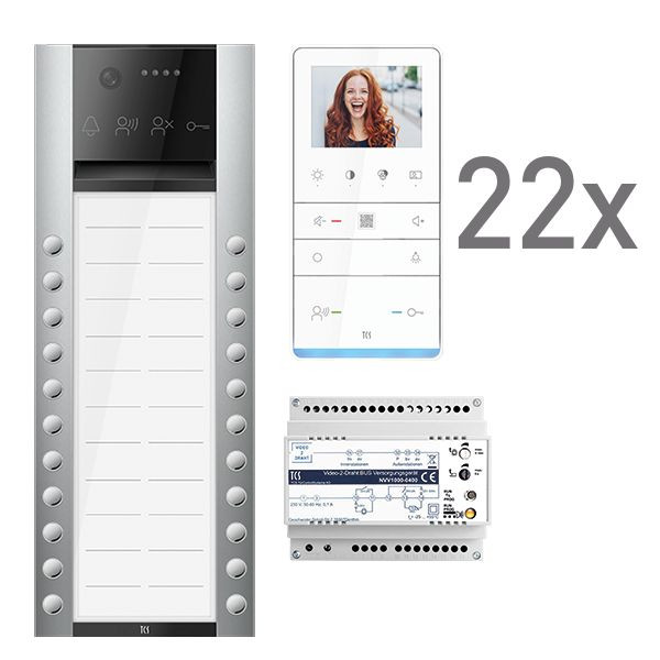 Vorkonfiguriertes Video Paket für 22 Wohneinheiten für den TCS:BUS bestehend aus: 1x PES PRO Video Außenstation 22T AP EN, Artikelnummer: AVA630222-0010, vorprogrammiert, 22x TASTA PRO Video Freisprecher 3,5" AP WS, Artikelnummer: IVW6511-0145, 1x Video-2-Draht:BUS Versorgungsgerät, Artikelnummer: NVV1000-0400. Das Paket ist ab Werk vorkonfiguriert und bedingt erweiterbar. Die Funktionen der Innen- und Außenstationen können mit TCS-Serviceprodukten bedingt verändert werden.