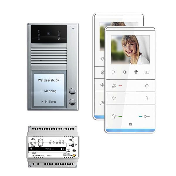 Vorkonfiguriertes Paket für 2 Wohneinheiten für den TCS:BUS bestehend aus: 1x Außenstation VPAK Color V2D 2Tasten AP EN, Artikelnummer: AVC12020-0010, vorprogrammiert, 2x TASTA PRO Video Freisprecher 3,5 AP WS, Artikelnummer: IVW6511-0145, 1x Video-2-Draht:BUS Versorgungsgerät, Artikelnummer: NVV1000-0400, Das Paket ist ab Werk vorkonfiguriert und bedingt erweiterbar, Die Funktionen der Innen- und Außenstationen können mit TCS-Serviceprodukten bedingt verändert werden, Die Komponenten unterstützen einen stand-alone-Betrieb