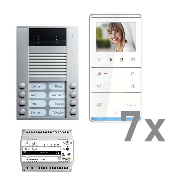 Vorkonfiguriertes Paket für 7 Wohneinheiten für den TCS:BUS bestehend aus: 1x Außenstation VPES color 130 Grad 8Tasten AP EN, Artikelnummer: AVE14083-0010, vorprogrammiert, 7x TASTA PRO Video Freisprecher 3,5 AP WS, Artikelnummer: IVW6511-0145, 1x Vers. + Steuerg. VBVS05/02 1Strang 6TE, Artikelnummer: VBVS05-SG/02, Das Paket ist ab Werk vorkonfiguriert und bedingt erweiterbar, Die Funktionen der Innen- und Außenstationen können mit TCS-Serviceprodukten bedingt verändert werden, Die Komponenten unterstützen einen stand-alone-Betrieb