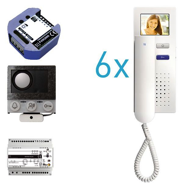 Vorkonfiguriertes Paket (Briefkasten) für 6 Wohneinheiten für den TCS:BUS bestehend aus:, 1x Einbau-Türlautsprecher (Serie TCU) 16WE, Artikelnummer: ASI12000-0000, vorprogrammiert, 6x Objekt- Video Innenstation, Artikelnummer: IVH3222-0140, 1x Vers. + Steuerg. VBVS05/02 1Strang 6TE, Artikelnummer: VBVS05-SG/02, 1x Videozweidrahtsender UP, Artikelnummer: FVW2000-0600, Video Kamera bauseitig vorhanden, Das Paket ist ab Werk vorkonfiguriert und bedingt erweiterbar, Die Funktionen der Innen- und Außenstationen können mit TCS-Serviceprodukten bedingt verändert werden, Die Komponenten unterstützen einen stand-alone-Betrieb