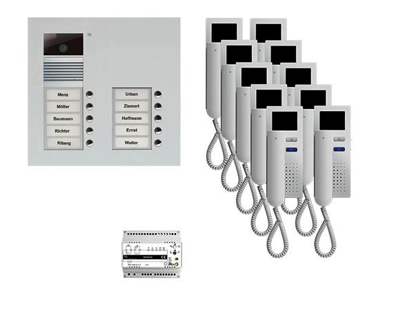Vorkonfiguriertes Paket für 10 Wohneinheiten für den TCS:BUS bestehend aus: 1x Außenstation VPUK color 10Tasten 2Spalten UP EN, Artikelnummer: AVU15100-0010, vorprogrammiert, 10x Objekt- Video Innenstation, Artikelnummer: IVH3222-0140, 1x Versorgungs- und Steuergerät Video 8 T, Artikelnummer: NBV2600-0400, Das Paket ist ab Werk vorkonfiguriert und bedingt erweiterbar, Die Funktionen der Innen- und Außenstationen können mit TCS-Serviceprodukten bedingt verändert werden, Die Komponenten unterstützen einen stand-alone-Betrieb