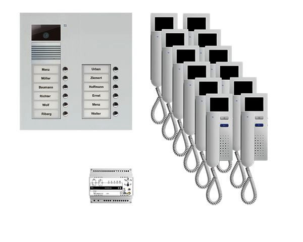 Vorkonfiguriertes Paket für 12 Wohneinheiten für den TCS:BUS bestehend aus: 1x Außenstation VPUK color 12Tasten 2Spalten UP EN, Artikelnummer: AVU15120-0010, vorprogrammiert, 12x Objekt- Video Innenstation, Artikelnummer: IVH3222-0140, 1x Versorgungs- und Steuergerät Video 8 T, Artikelnummer: NBV2600-0400, Das Paket ist ab Werk vorkonfiguriert und bedingt erweiterbar, Die Funktionen der Innen- und Außenstationen können mit TCS-Serviceprodukten bedingt verändert werden, Die Komponenten unterstützen einen stand-alone-Betrieb