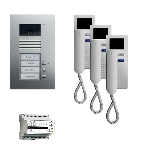Vorkonfiguriertes Paket für 3 Wohneinheiten für den TCS:BUS bestehend aus: 1x Außenstation VPUK color 3Tasten 1Spalte UP EN, Artikelnummer: AVU14030-0010, vorprogrammiert, 3x Objekt- Video Innenstation, Artikelnummer: IVH3222-0140, 1x Vers. + Steuerg. VBVS05/02 1Strang 6TE, Artikelnummer: VBVS05-SG/02, Das Paket ist ab Werk vorkonfiguriert und bedingt erweiterbar, Die Funktionen der Innen- und Außenstationen können mit TCS-Serviceprodukten bedingt verändert werden, Die Komponenten unterstützen einen stand-alone-Betrieb