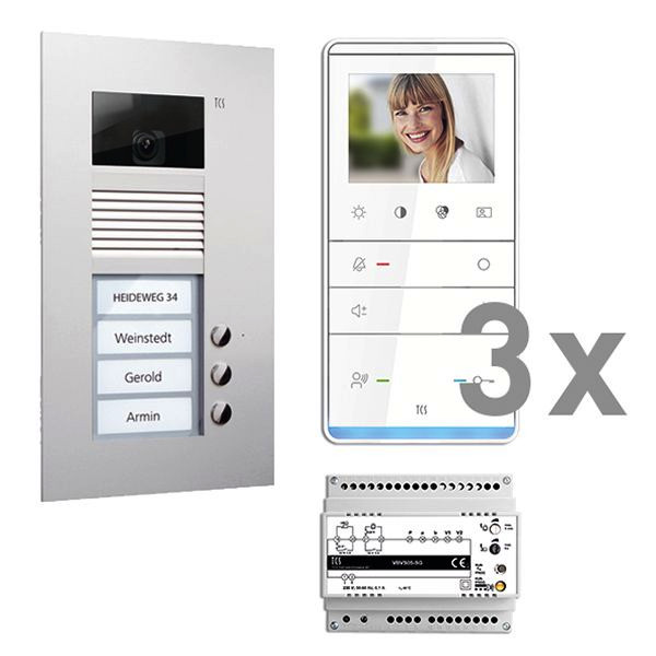 Vorkonfiguriertes Paket für 3 Wohneinheiten für den TCS:BUS bestehend aus: 1x Außenstation VPUK color 3Tasten 1Spalte UP EN, Artikelnummer: AVU14030-0010, vorprogrammiert, 3x TASTA 3,5 Zoll Freispr. AP WS/WS, Artikelnummer: IVW6511-0145, 1x Vers. + Steuerg. VBVS05/02 1Strang 6TE, Artikelnummer: VBVS05-SG/02, Das Paket ist ab Werk vorkonfiguriert und bedingt erweiterbar, Die Funktionen der Innen- und Außenstationen können mit TCS-Serviceprodukten bedingt verändert werden, Die Komponenten unterstützen einen stand-alone-Betrieb