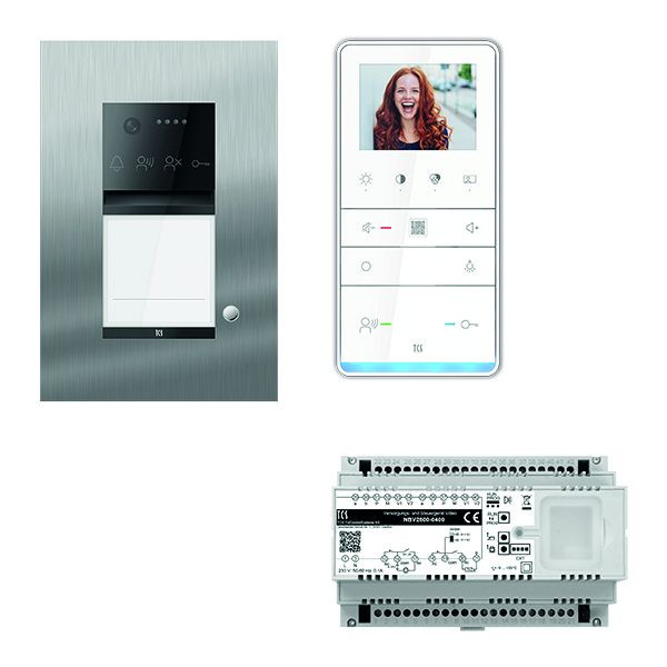 Vorkonfiguriertes Video Paket für 1 Wohneinheit für den TCS:BUS bestehend aus: 1x PES PRO Video Außenstation 1T UP ES, Artikelnummer: AVU600101-0030, vorprogrammiert, 1x TASTA PRO Video Freisprecher 3,5" AP WS, Artikelnummer: IVW6511-0145, 1x Versorgungs- und Steuergerät Video 8 TE, Artikelnummer: NBV2600-0400. Das Paket ist ab Werk vorkonfiguriert und bedingt erweiterbar. Die Funktionen der Innen- und Außenstationen können mit TCS-Serviceprodukten bedingt verändert werden.