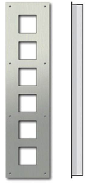 Frontplatte 3 mm Edelstahl geschliffen, zum Einbau von Modulen der Serie AMI in individualisierter Bestückung, Ausschnittsmaß 82 mm x 82 mm, Modulrasterabstand 120 mm, UP Kasten