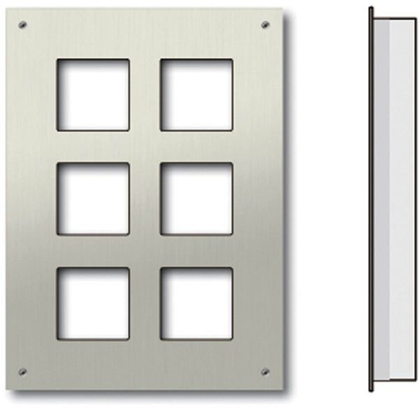 Frontplatte 3 mm Edelstahl geschliffen, zum Einbau von Modulen der Serie AMI in individualisierter Bestückung, Ausschnittsmaß 82 mm x 82 mm, Modulrasterabstand 120 mm, UP Kasten