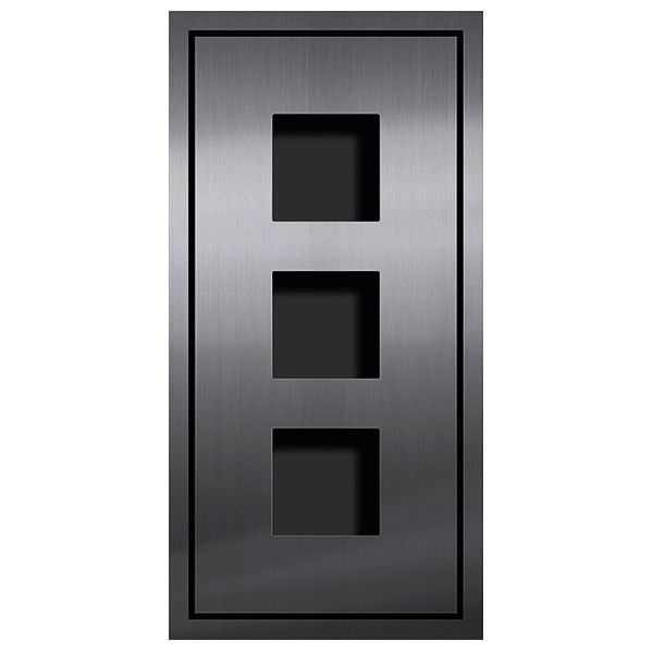 Produktmerkmale, Frontplatte+Aufnahmefach und Inputzkasten, Anzahl integrierbarer Module: 3, Modulintegration: Verschraubung auf Gewindebolzen, Öffnungsprinzip: Schiebemechanismus in oberer Fuge, funktional erweiterbar: mit Außenstationsmodulen der Serie AMI, Montageform: Inputzmontage/Unterputzmontage, Material / Farbe Frontplatte: Edelstahl geschliffen und gebürstet, Material / Farbe UP-Kasten: Edelstahl geschliffen und gebürstet, technische Daten, Materialstärke Frontplatte: 3 mm, Frontplattenausschnitt HxB mm: 82x82, Frontplatte HxBxT mm: 440?x?200?x?3, UP-Kasten HxBxT mm: 480?x?240?x?50, zulässige Umgebungstemperatur: -20 bis +50 Grad C, optionales Zubehör, Funktionsmodule der Serie AMI, Unterkonstruktion für WDVS und hinterlüftete Vorhangfassaden