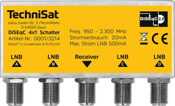 DiSEqC Positionsrelais mit Wetterschutzgehäuse, 4 Sat-Positionen für 1 Teilnehmer, geringer Eigenstomverbrauch - nur 20 mA
