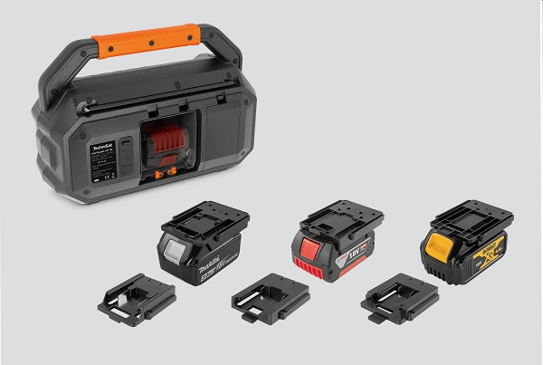 DAB+ Digitalradio, FM-Radio mit RDS, integrierter Akku für bis zu 8 Stunden Wiedergabe und optionale Erweiterung durch externen Akku, 18V Akkuaufnahme kompatibel zu Makita, Bosch Professional und DeWalt 18V Systemen (max. Bauhöhe 82mm), IPX4 Schutz gegen Spritzwasser, robuste Bauweise geeignet für Außenbereich und Baustelle, Favoritenspeicher (20 DAB+/20 FM), 2,4 Zoll TFT Farbdisplay, Bluetooth-Audiostreaming (Empfang), 2 x 15 Watt Leistung über Netzbetrieb und 2 x 8 Watt über Akku, Gewicht 2,38 kg, BxHxT 34 x 25 x 17 cm