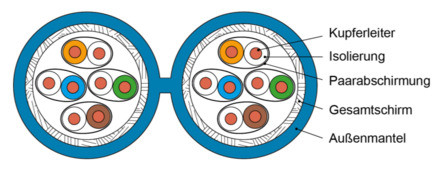Kupferkabel S/FTP beschreiben gemäß EN50173-1 Kabel mit individueller Paarschirmung aus Aluminiumfolie umgeben von einem Geflecht als Gesamtschirm. Die S/FTP Kabel weisen sehr geringe Laufzeitunterschiede zwischen den Paaren auf und eignen sich optimal für die Übertragung sehr hoher Datenraten.