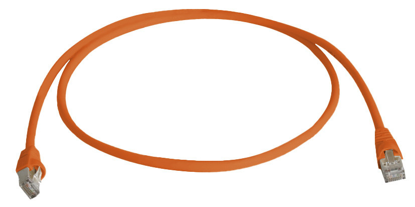geschirmt, beidseitig mit RJ45-Steckern, Belegung 1:1 nach T568B, Kabelaufbau S/FTP 4x2xAWG27/7 PiMF, Gesamtabschirmung durch verzinntes Cu-Geflecht, Innenleiter Cu-Litze 0,42 mm AWG27 (7/0,14), Kabelmantel und Tülle gleichfarbig, LSZH Kabelmantel, Brennverhalten nach IEC 60332-1, Kabelausendurchmesser 5,7mm, angespritzte Tülle mit Langenangabe und Rasthebelschutz, Lebensdauer:größer gleich 750 Steckzyklen, Kabeltyp: S/FTP, Cat.6A. Abstand Steckverbindertyp Anschluss 1: RJ45 8(8), Steckverbindertyp Anschluss 2: RJ45 8(8), Mantel-Farbe: orange, Kabelkonstruktion: 4x2, AWG-Querschnitt: 27, Rasthebelschutz: ja, Pinbelegung: 1:1
