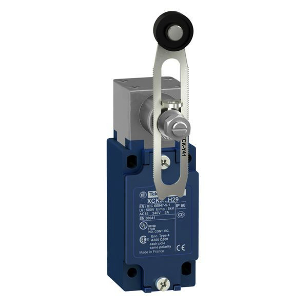 OsiSense XC ? Positionsschalter XCK J. Anschluss M12, Betätiger Längenverstellbarer Rollenhebel, Schaltkontakte Ö + S, Schaltprinzip Sprung. Komplettgerät, metallgekapselt, Monoblockgehäuse. B/T/H 40 x 44 x 81,5 mm (ohne Betätiger). mit M12-Steckverbinder oder Leitungseinführung ISO M20 x 1,5 oder Pg13. Schutzart IP 66 und IK 07.