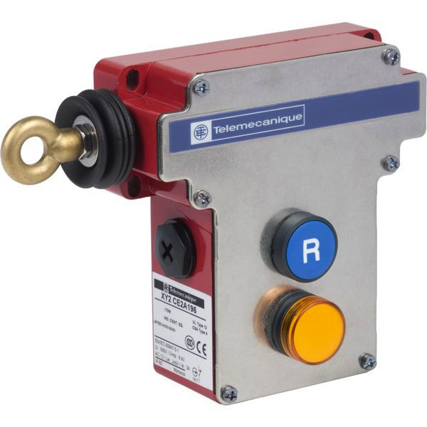 Seilzug-Notschalter für Seillängen bis max. 70m, Betätigung von links, Schaltausgänge 2ÖS, Leuchtmelder.