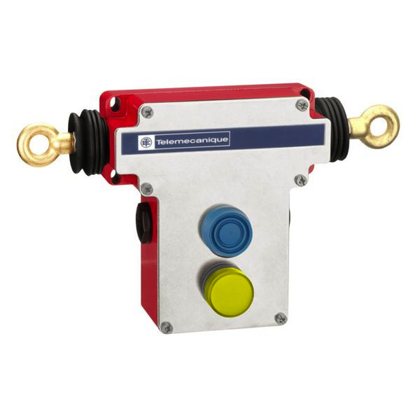 Seilzug-Notschalter für Seillängen bis max. 2x100m, beidseitige Betätigung, Standardmanschetten, Rückstellung Taster mit Schutzkappe, LED 230 V, Schaltausgänge 2Ö+2S.