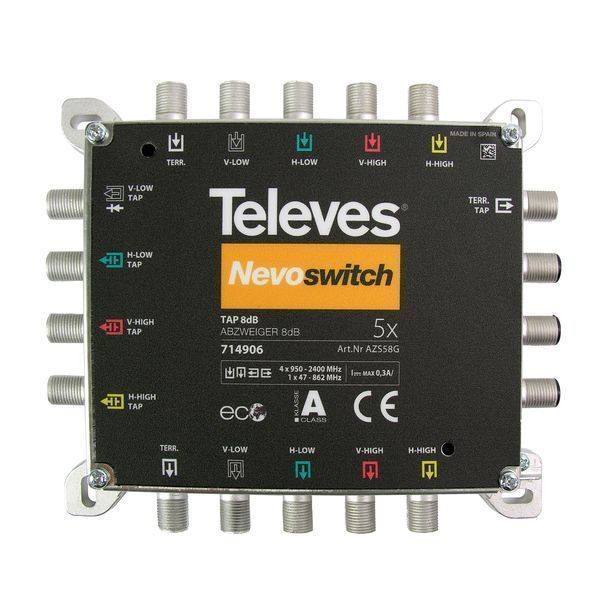 Nevo Serie 5-fach Abzweiger 5 - 2400 MHz im Guss-Gehäuse. Durchgangsdämpfung 1,5 dB, Abzweigdämpfung Sat 8 dB, Terr. 25 dB. DC-Durchlass auf Vertikal Low und Terr.. Abmessungen (BxHxT) 137x120x30 mm