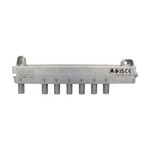 6-fach Abzweiger 5-2400 MHz im Gußgehäuse mit Wandabstand und F-Anschlüssen. Eingänge und Ausgänge auf einer Seite, dadurch weniger Platzbedarf, DC-Pass auf der Stammleitung, Abzweige DC entkoppelt. AD: 12 dB, DD: 2,5/2,6 dB