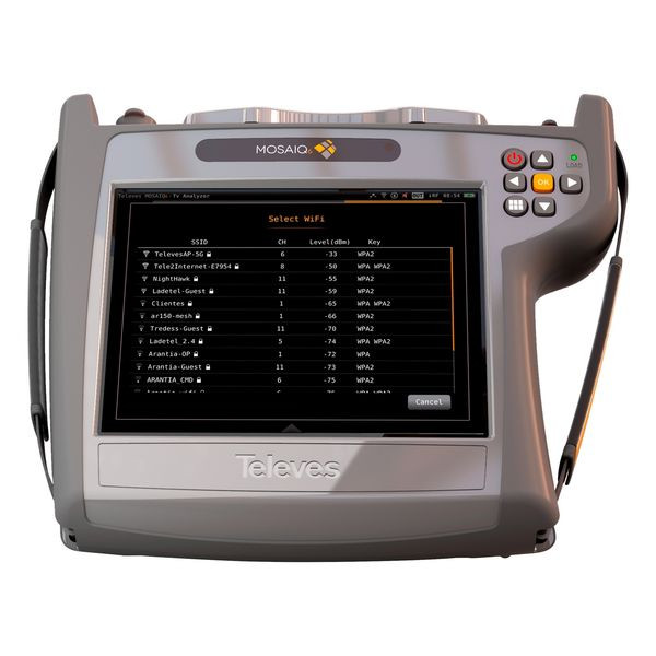 Die Option "WiFi-Analysator 2,4/5GHz" führt eine umfassende Analyse des gesamten WiFi- Bandes (2,4 und 5 GHz) durch, um alle verfügbaren WiFi-Netzwerke zu finden, zu identifizieren und zu messen. Hierfür bietet das MOSAIQ6 4 verschiedene Analysefunktionen an: Wi-Fi Liste: zeigt eine Liste aller gefundenen Netzwerke und identifiziert für jedes einzelne: SSID, BSSID, Kanal, Frequenz, Verschlüsselungsmodus und Leistung des Zugangspunktes. Wi-Fi-Messungen: zeigt für ein bestimmtes Netzwerk den aktuellen Leistungswert des Zugangs- punktes und ein Diagramm seiner Veränderung während eines wählbaren Zeitintervalls. Zeitdiagramm: bietet ein Zeitdiagramm mit der Historie der Leistungsmessungen aller erkannten Wi-Fi-Netzwerke. Kanalkarte: zeigt ein Diagramm mit der Kanalverteilung der erkannten WiFi-Netze.
