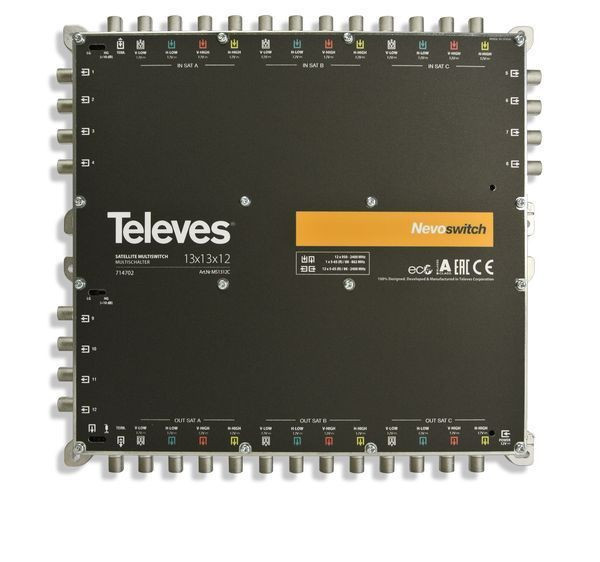 Nevo Multischalter 13in12 im Gussgehäuse, kaskadierbar, zu- und abschaltbare Abschlusswiderstände in jedem Einzel- und Kaskadenschalter, Schalter 10dB-Eingangsverstärkung für alle SAT-Eingänge zu/abschaltbar. Durchgangsdämpfung SAT: 6dB / Terr.: 3dB,SAT TN-Dämpfung 1-8/9-16/17-24/25-32 = 950 MHz 8/11/-/- und 2400MHz 3/6/-/- dB, Terr. TN-Dämpfung 1-8/9-16/17-24/25-32 = 2/5/-/- RK TN-Dämpfung 40dB, DC-Durchlass auf Vertikal Low und Terr., max. Eingangspegel Sat 102 / Terr. 104 dBµV, Netzteil erforderlich (MS-NT1228), Stromaufnahme Netzteil 210mA, Sat-Receiver 33mA, Abmessungen (BxHxT) = 280x253x30mm