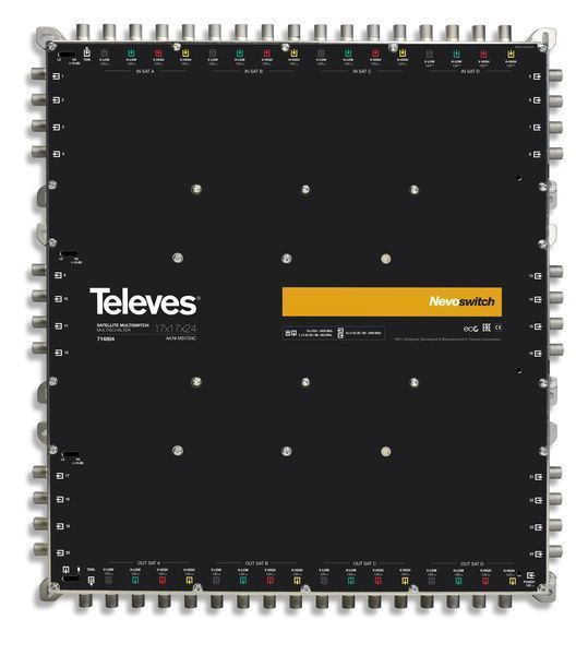 Nevo Multischalter 17in24 im Gussgehäuse, kaskadierbar, zu- und abschaltbare Abschlusswiderstände in jedem Einzel- und Kaskadenschalter, Schalter 10dB-Eingangsverstärkung für alle SAT-Eingänge zu/abschaltbar. Durchgangsdämpfung SAT: 9dB / Terr.: 6dB,SAT TN-Dämpfung 1-8/9-16/17-24/25-32 = 950 MHz 9/12/15/- und 2400MHz 4/7/10/- dB, Terr. TN-Dämpfung 1-8/9-16/17-24/25-32 = 3/5/8/- RK TN-Dämpfung 40dB, DC-Durchlass auf Vertikal Low und Terr., max. Eingangspegel Sat 102 / Terr. 104 dBµV. Netzteil erforderlich (MS-NT1228), Stromaufnahme Netzteil 310mA, Sat-Receiver 33mA. Abmessungen (BxHxT) = 350x386x30mm