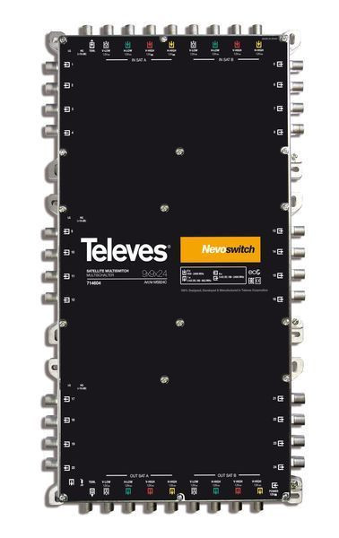 Nevo Multischalter 9in24 im Gussgehäuse, kaskadierbar, zu- und abschaltbare Abschlusswiderstände in jedem Einzel- und Kaskadenschalter, Schalter 10dB-Eingangsverstärkung für alle SAT-Eingänge zu/abschaltbar. Durchgangsdämpfung SAT: 9dB / Terr.: 6dB, SAT TN-Dämpfung 1-8/9-16/17-24/25-32 = 950 MHz 8/11/14/- und 2400MHz 3/6/9/- dB, Terr. TN-Dämpfung 1-8/9-16/17-24/25-32 = 2/5/7/- RK TN-Dämpfung 40dB, DC-Durchlass auf Vertikal Low und Terr., max. Eingangspegel Sat 102 / Terr. 104 dBµV. Netzteil erforderlich (MS-NT1208N), Stromaufnahme Netzteil 310mA, Sat-Receiver 33mA. Abmessungen (BxHxT) = 208x386x30mm