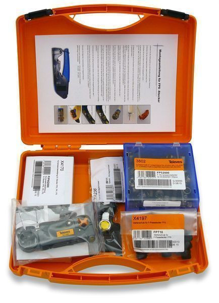 Kompressionsstecker-Set im Koffer bestehend aus: 1 x Kompressionszange FIPW2000, 1 x Abisolierer FCS10, 50 x Kompressionsstecker FPS2000, 10 x Dichtungstüllen (für LNB) FPT10, 1 x Spezialgabelschlüssel IBI11N.