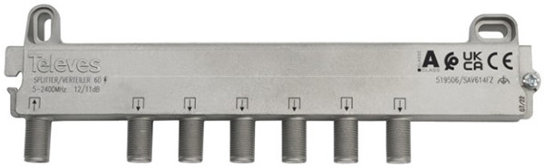 6-fach Verteiler 5-2400 MHz im Gußgehäuse mit Wandabstand und F-Anschlüssen. Eingänge und Ausgänge auf einer Seite, dadurch weniger Platzbedarf, brummentkoppelt, DC-Pass Ausgang. -> Eingang. Verteildämpfung 11dB