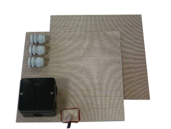 selbstklebendes und witterungsbeständiges Silikon-Glasfaser-Gewebe Strom-Zuleitungkabel 2x0,5qmm / Länge 2000mm, Silikonisolation Schutzart IP54 Versorgungsspannung 230V 50Hz Leistung 62Watt VDE geprüft EN 60335-1 Heiztemperatur bis + 30° Größe 250 x 250