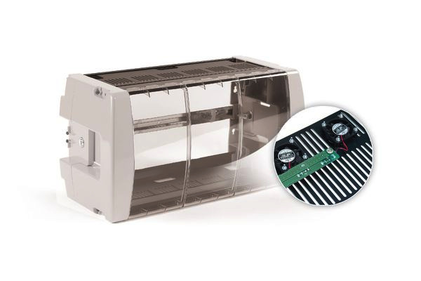 T.0X Kunststoffgehäuse, abschießbar mit integrierter, temperaturgeregelten Lüftereinheit zum Einbau von max. 7 Kanalzügen und Netzteil.