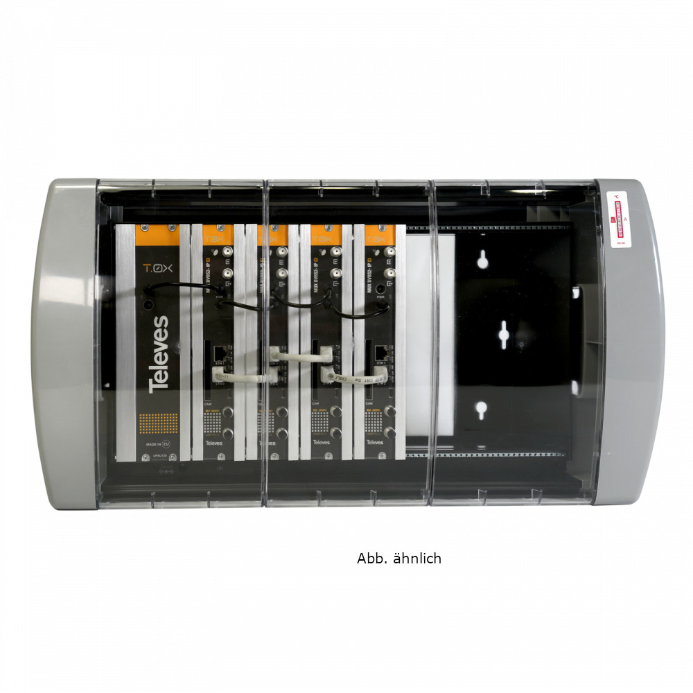 Komplettanlagen für 6-/8-/10-/12- oder 14- Transponder fertig vormontiert mit Standardprogrammierung, bestehend aus Gehäuse UGH7, Netzteil UPSU120 und ... TWIN DVB-S2 in QAM Umsetzer