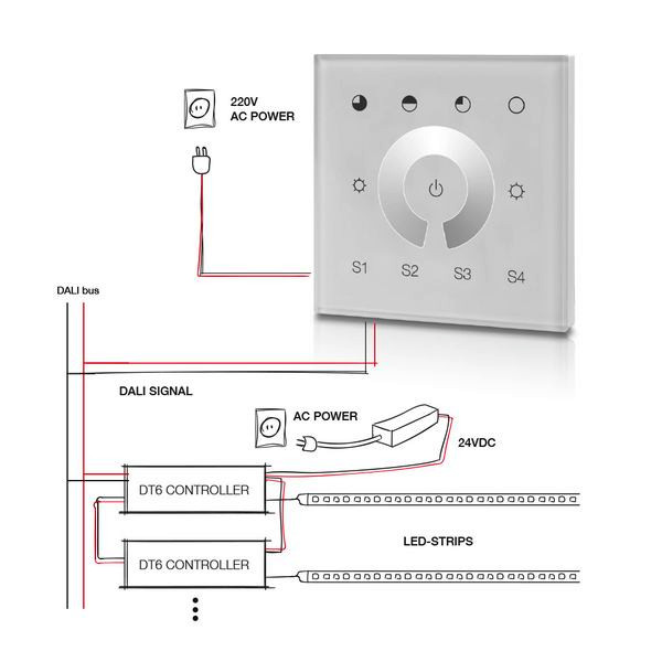 Berührungsgesteuertes Glas-Bedienfeld. Entspricht dem DALI-Standardprotokoll IEC 62386-102, IEC 62386-207 und ist kompatibel mit DALI-Produkten von anderen internationalen Unternehmen. Eingebautes 100mA DALI-Netzteil zur Versorgung von bis zu max. 50 DALI-EVG. Stromversorgung über den DALI-Bus, wenn nicht an das Stromnetz angeschlossen.