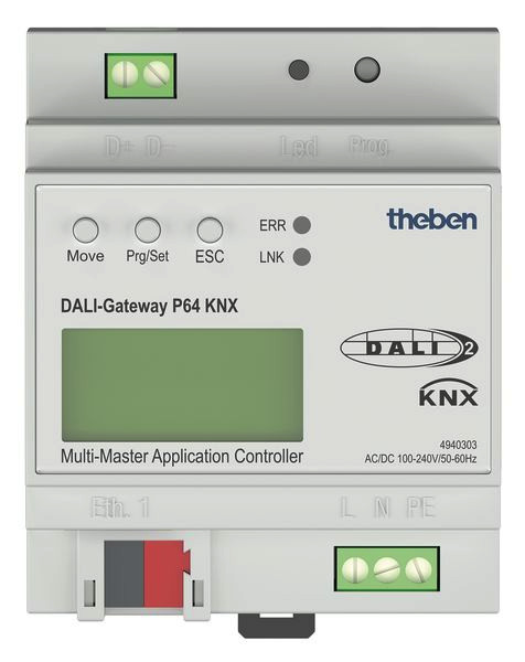 Multi-Master Application-Controller als Schnittstelle zwischen dem DALI-System und dem KNX-Bus, DALI-2 zertifiziert, Sichere Inbetriebnahme und Kommunikation durch Unterstützung von KNX Data Secure, Integration von 8 DALI-2 Sensoren (Bewegung/Präsenz und Helligkeit) gemäß EN 62386-303 und -304, Ansteuerung von 64 DALI-Teilnehmern in 16 Gruppen oder in Einzelansteuerung, Steuerung von Lichtfarbe und Farbtemperatur gemäß EN 62386-209 (DT-8) in Gruppen oder einzeln, Automatische Anpassung der Farbtemperatur an den Dimmwert, Szenenmodul für 16 Szenen (einschließlich Farbsteuerung DT8), Zeitabhängige Steuerung in Helligkeit, Lichtfarbe und Farbtemperatur, Szenenmodul für 16 Szenen (einschließlich Farbeinstellung DT8), Effektmodul für Ablaufsteuerungen, Unterstützung von Einzelbatterienotleuchten und Notleuchtensysteme mit Zentralbatterie (EN 62386-202, DT-1), LC-Display (2x 12 Zeichen) zur Menüführung bei Inbetriebnahme und Parametrierung, Inbetriebnahme über die Bedienelemente am Gerät, über den integrierten Webserver oder über die kostenlose ETS-App (DCA)
