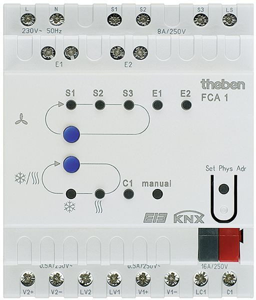Reiheneinbaugerät, Breite 4 TE, steuert Fan Coils mit bis zu 3 Lüfterstufen (8 A) und das Heiz-bzw. Kühlventil (Triacs), Es werden 2 Rohr und 4 Rohr-Systeme unterstützt, Dabei können 2 Punkt und 3 Punkt-Ventile angesteuert werden, Über ein Zusatzrelais (16 A) ist das Ansteuern von wahlweise eines elektrischen Heizregisters oder eines elektrischen Kühlregisters möglich