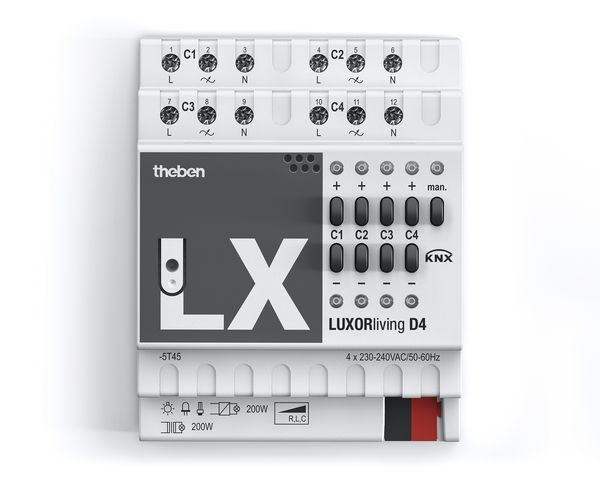 Universal-Dimmaktor 4-fach für das Smart Home System LUXORliving, Dimmbereich 0-100%, maximale Last: 4x 200 W/VA, zum Dimmen von Glühlampen, Niedervolt und Hochvolt-Halogenlampen, dimmbare Energiesparlampen, dimmbare LED-Retrofitlampen, unterschiedliche Dimmkurven ermöglichen das stufenlose Dimmen aller Lampenarten, automatische Lasterkennung (wählbar), Manuelle Bedienung 0, 25, 50, 75 und 100% oder Test