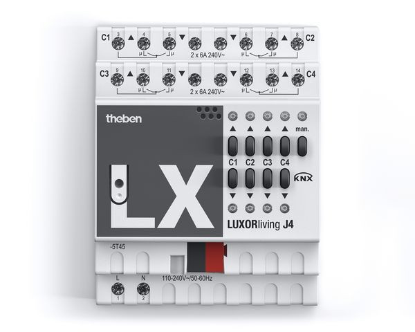 Jalousieaktor für das Smart Home System LUXORliving, 4-fach Antriebssteuerung, Relaisausgänge für 4 Antriebe, z. B. für Jalousien, Rollladen, Markisen, manuelle Bedienung am Gerät, Schlupfkorrektur, Antrieb frei parametrierbar, Handschalter AUF/AB und LEDs, 4 Schließer