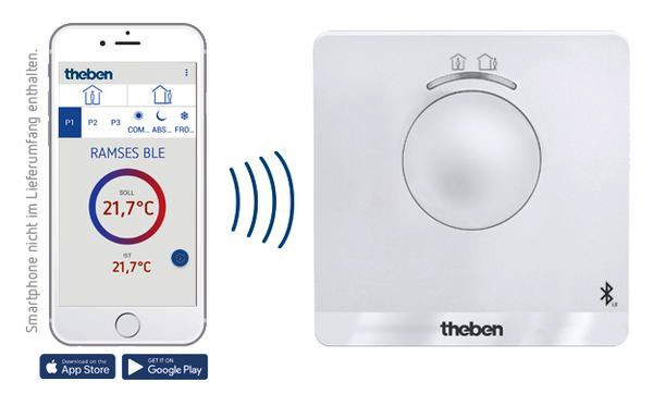Digitaler Uhrenthermostat mit Wochenprogramm, Bedienung per App, Direkte Bluetooth-Low-Energy-Verbindung (BLE) zwischen App und RAMSES BLE, keine Kommunikation über das Internet, Einstellungen bequem per App mit intuitiver Bedienung vom Smartphone oder Tablet aus, Erhöhter Bedienkomfort, kein Display am Gerät, veränderbare Grundprogramme, Programmierbare Schaltzeiten, Optimierungsfunktion, Frostschutz
