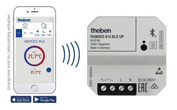 Digitaler Uhrenthermostat mit Wochenprogramm zur UP-Montage in Unterputzdose, unter der Blindabdeckung oder dem Dosendeckel, Bedienung per App, Direkte Bluetooth-Low-Energy-Verbindung (BLE) zwischen App und RAMSES BLE, keine Kommunikation über das Internet, Einstellungen bequem per App mit intuitiver Bedienung vom Smartphone oder Tablet aus, Erhöhter Bedienkomfort, veränderbare Grundprogramme, programmierbare Schaltzeiten, Optimierungsfunktion, Frostschutz, externer Eingang