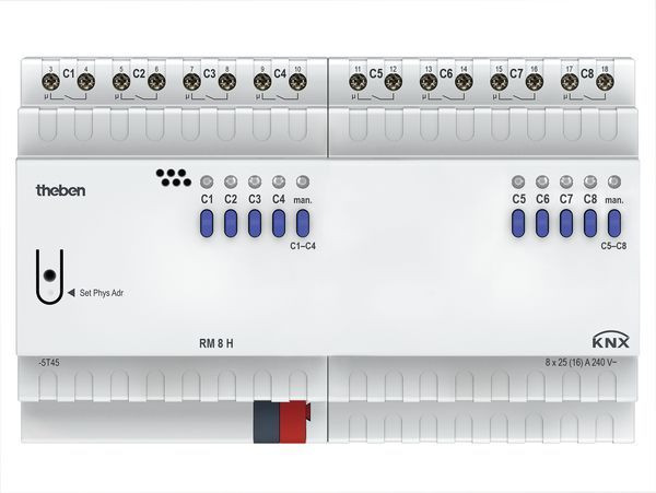 KNX Schaltaktor 8-fach, 25 A, mit Relaisausgänge für 8 Schaltkanäle, Reiheneinbaugehäuse, Breite 8 TE, C-Last, LED Schaltzustandsanzeige je Kanal, Handschalter mit Statusanzeige (auch ohne Busspannung), Verknüpfungen, Kontaktart (Öffner/Schließer) und Teilnahme an Zentralbefehlen wie Dauer-Ein, Dauer-Aus, Zentral-Schalten und Szene speichern/abrufen, Schaltfunktionen: Ein/Aus, Impuls, Ein/Aus-Verzögerung, Treppenlicht mit Vorwarnen nach DIN 18015-2, logische Verknüpfungen: Sperren, UND, Freigeben, ODER, Rückmelde-Objekt für jeden Kanal, Zentral-Objekte mit und ohne Priorität, Szenen abrufen und speichern (Objekt), Szenenobjekt für jeden Kanal