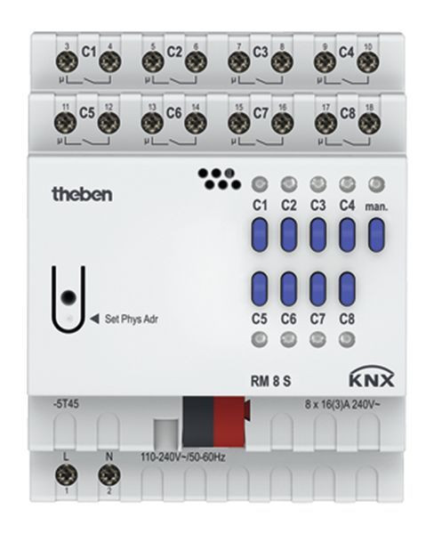 KNX Schaltaktor mit Relaisausgängen für 8 Schaltkanäle, Reiheneinbaugehäuse Breite 4 TE, C-Last, LED Schaltzustandsanzeige für jeden Kanal, Handschalter mit Statusanzeige (auch ohne Busspannung), Verknüpfungen, Kontaktart (Öffner/Schließer) und Teilnahme an Zentralbefehlen wie Dauer-Ein, Dauer-Aus, Zentral-Schalten und Szene speichern/abrufen, Schaltfunktionen: Ein/Aus, Impuls, Ein/Aus-Verzögerung, Treppenlicht mit Vorwarnen nach DIN 18015-2, logische Verknüpfungen: Sperren, UND, Freigeben, ODER. Rückmelde-Objekt für jeden Kanal, Zentral-Objekte mit und ohne Priorität, Szenen abrufen und speichern (Objekt), Szenenobjekt für jeden Kanal