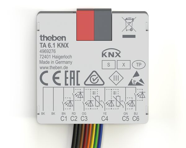 6-fach Binäreingang-Tasterschnittstelle, KNX Data Secure, Kabelanschluss 8-polig, NTC Eingänge für Ist-Temperaturerfassung, Können mit konventionellen Tastern/Schaltern in Unterputzdosen eingebaut werden, Freie Zuordnung der Funktionen: Schalter/Taster, Dimmen, Jalousie, Wertgeber, Zähler, Sequenzen, Temperatur messen, LED steuern, Flexible LED-Ansteuerung, dank erhöhtem Ausgangsstrom von 3 mA können handelsübliche LEDs und Low Curent LEDs angesteuert werden, Eingänge umparametrierbar zu Ausgängen mit parametrierbarer Blink- und Pulsierfunktion, Kennzeichnung der Adernpaare über Farbcodierung, Seitliche Vertiefungen am Gehäuse für die Befestigungskrallen der Schalter/Taster