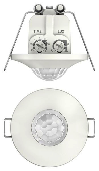 Präsenzmelder für Deckeneinbau, Erfassungsbereich rund, automatische helligkeitsabhängige Steuerung für Beleuchtung, Mischlichtmessung, Helligkeitswerte und Ausschaltverzögerung einstellbar, Fernbedienbar und manuelles Ein- und Ausschalten möglich