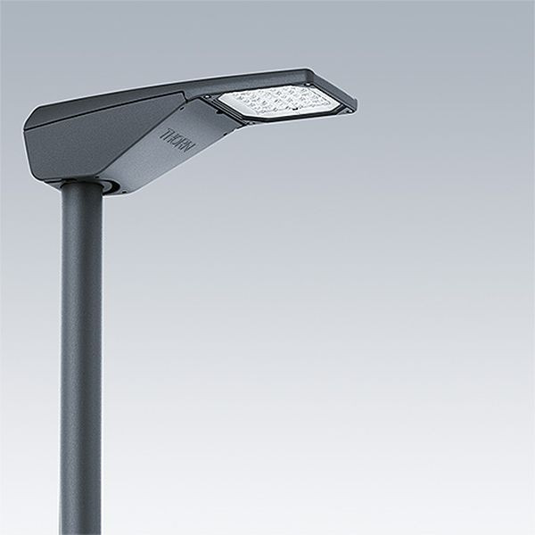 Eine LED-Straßenleuchte, Baugröße: extrem klein, mit 12 LEDs, betrieben mit 350mA, Optik: Schmale Straße. Programmierbarer LED-Treiber. Schutzklasse II, IP66, IK09. Gehäuse: Druckguss aus Aluminium (EN AC-44300), THORN DUNKELGRAU, strukturiert, (ähnlich DB 703 / AKZO 900) pulverbeschichtet, texturiert. Abdeckung: Glas, vergütet. Schrauben: Edelstahl, mit Ecolubric(R)-Behandlung. Mastaufsatzmontage (Durchmesser 60/76 mm, 0°/5°/10° Neigung) oder Mastansatzmontage (Durchmesser 34/42/49/60 mm, 0°/-5°/-10°/-15° Neigung). Zur Mastansatzmontage auf Durchmesser 34/42 mm sollte ein zusätzlicher Adapter (59005840 R2L2 MA34/42 NPA) bestellt werden. Ausgestattet mit 50% Leistungsreduktionsschaltung, aktiviert 3 Std. vor und 5 Std. nach einer berechneten Mitternacht. Kann bei der Installation mit einem leicht zugänglichen internen Schalter bzw. Kabel-Klemme deaktiviert werden. Inklusive LED-Modul mit 4000K. Abmessungen: 598 x 232 x 149 mm Leuchten Leistung: 13,8 W Leuchten Lichtstrom: 2174 lm Leuchten Lichtausbeute: 158 lm/W Gewicht: 7,4 kg Windangriffsfläche: 0.05 m²
