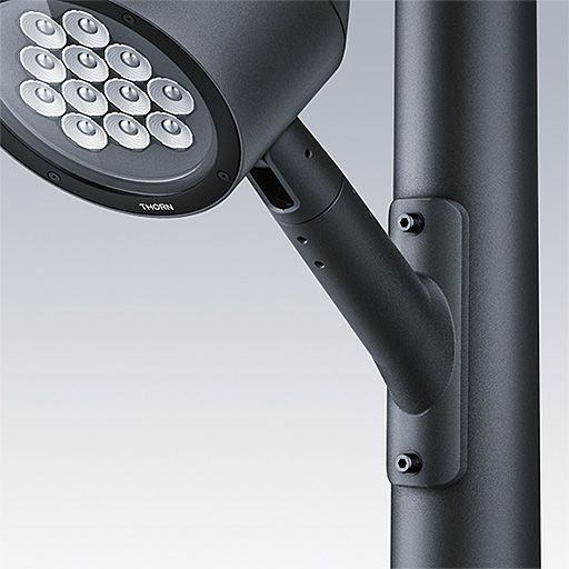 Masthalterung für Contrast 12L. Montage auf Mast mit Durchmesser von 60 mm bis 100 mm. Besteht aus AluminiumDruckguss, pulverbeschichtet mit THORN SCHWARZ, strukturiert, (ähnlich RAL 9005 / AKZO 200), texturiert. Horizontal und seitlich drehbar. Best resistance against corrosion. Compatible with seaside installation.
