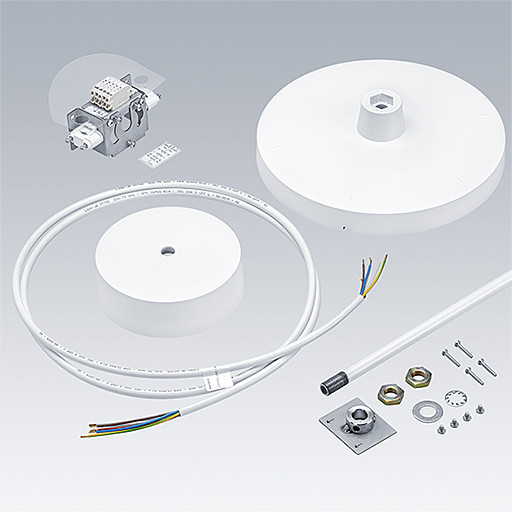 Pendelrohrabhängung für Produktfamilie NOVALINE Style. Zubehör für Größe S, bestehend aus weißem Pendelrohr in Länge 1800mm Klemmenanschluss, Halteblech mit weißer Abdeckung, weißer Deckenrosette aus Kunststoff und Einspeisungskabel. Gewicht: 2,09 kg