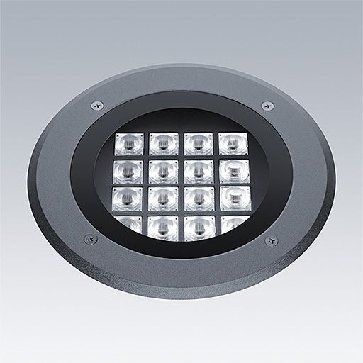 Cesar Opera, begehbar extragroß asymmetrisch abstrahlend, eine architektonische Bodeneinbau LED-Leuchte zur dekorativen Fassadenbeleuchtung, asymmetrisch. DALI-2 dimmbar LED-Treiber. Schutzklasse I, IP67, Schlagfestigkeit: IK09. Gehäuse: Druckguss Aluminium, pulverbeschichtet anthrazit. Betrieb bei Umgebungstemperatur: -20°C bis +45°C. Inklusive LED-Modul mit 3000K. Abmessungen: Durchmesser 275 x 245 mm Leuchten Leistung: 33 W Leuchten Lichtstrom: 2405 lm Leuchten Lichtausbeute: 73 lm/W Gewicht: 6,02 kg
